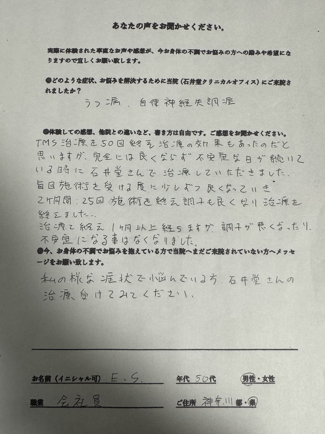 お名前 E・S 年齢50代 男性 会社員 神奈川県在中