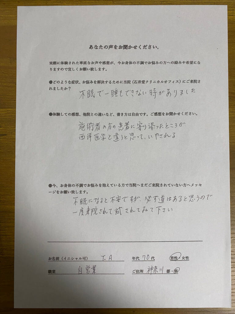 お名前 T.A 70代 男性 自営業 神奈川県在住