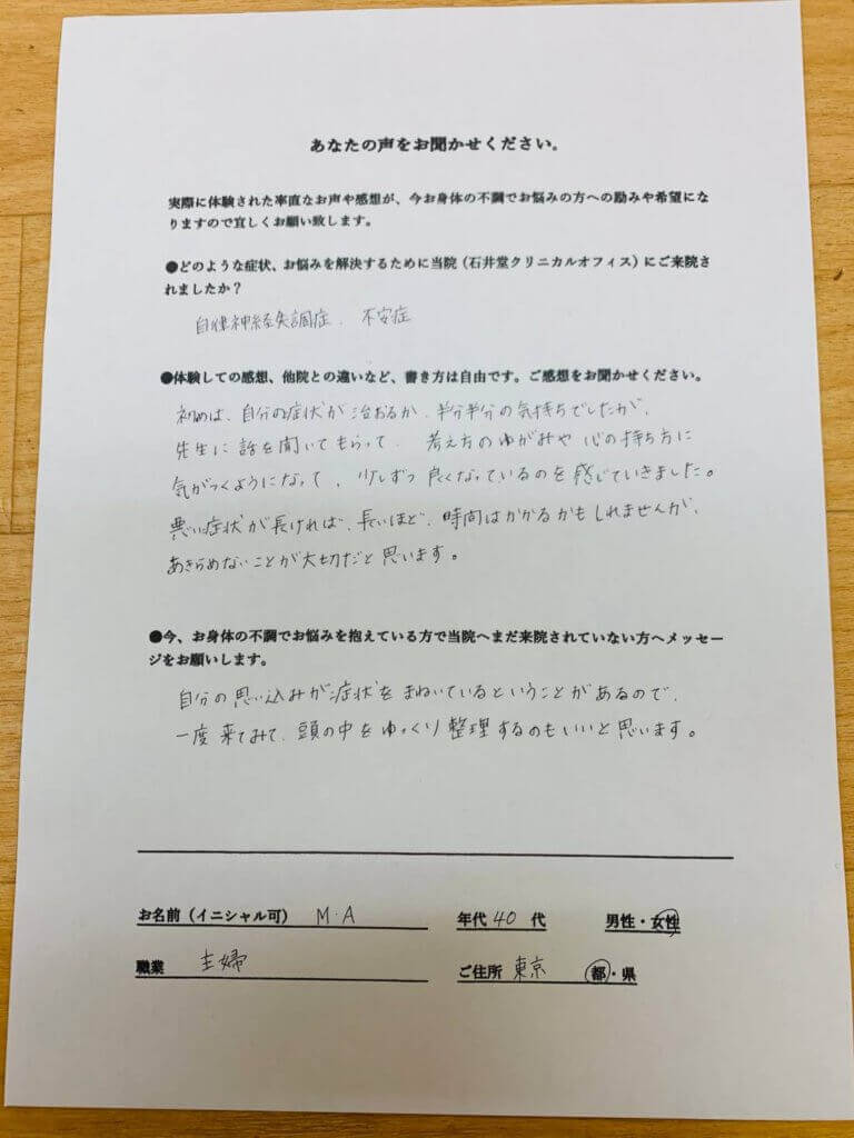 自律神経失調症、不安症にお悩みの患者様から感想文