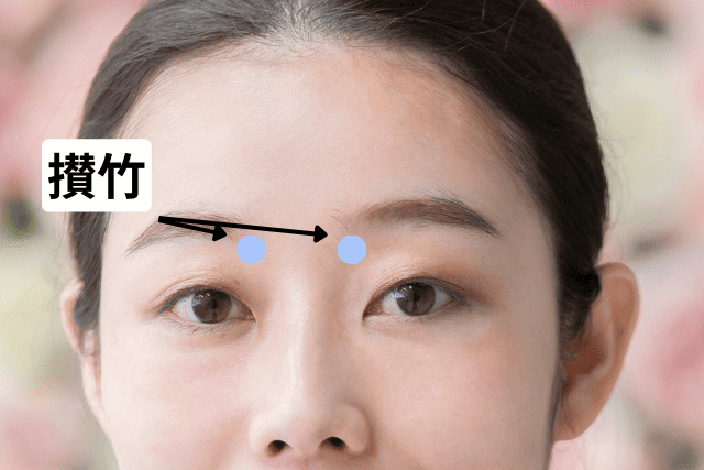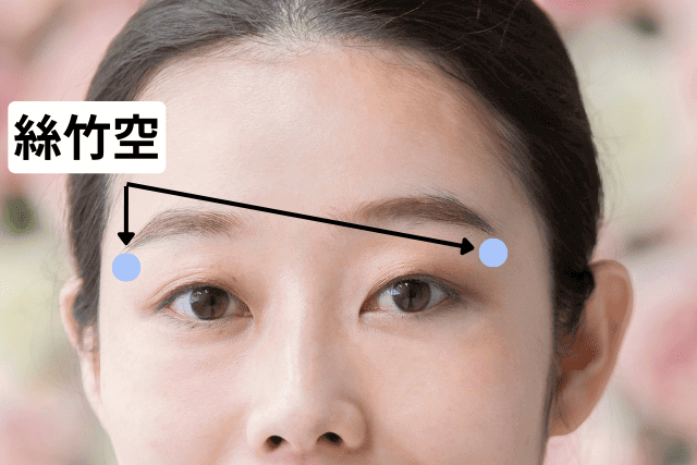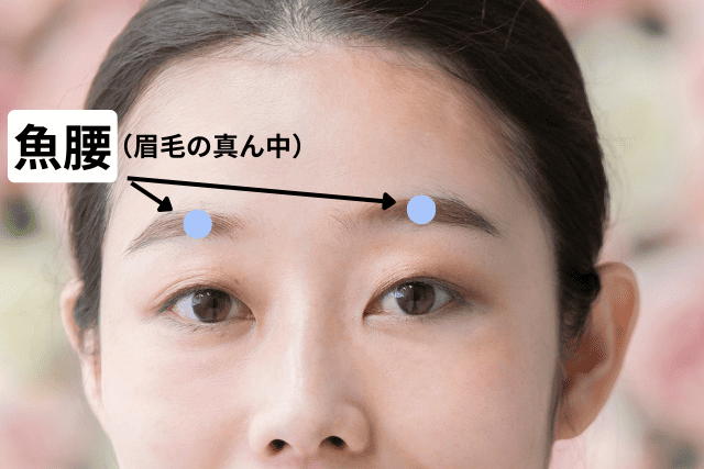 眉毛の中央から指1本分(約1.5〜2cm)ほど上にあるツボ。