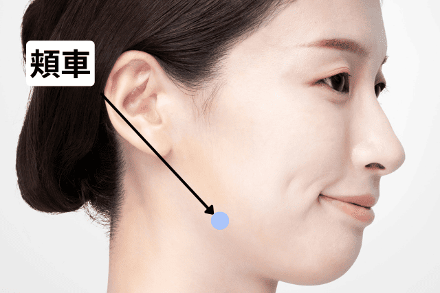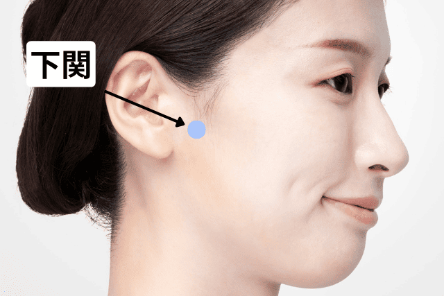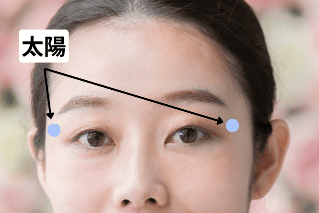 こめかみ付近、髪の生え際にあるツボで、口を開け閉めしたときに動きを感じられるあたり。(懸顱より上に位置します)